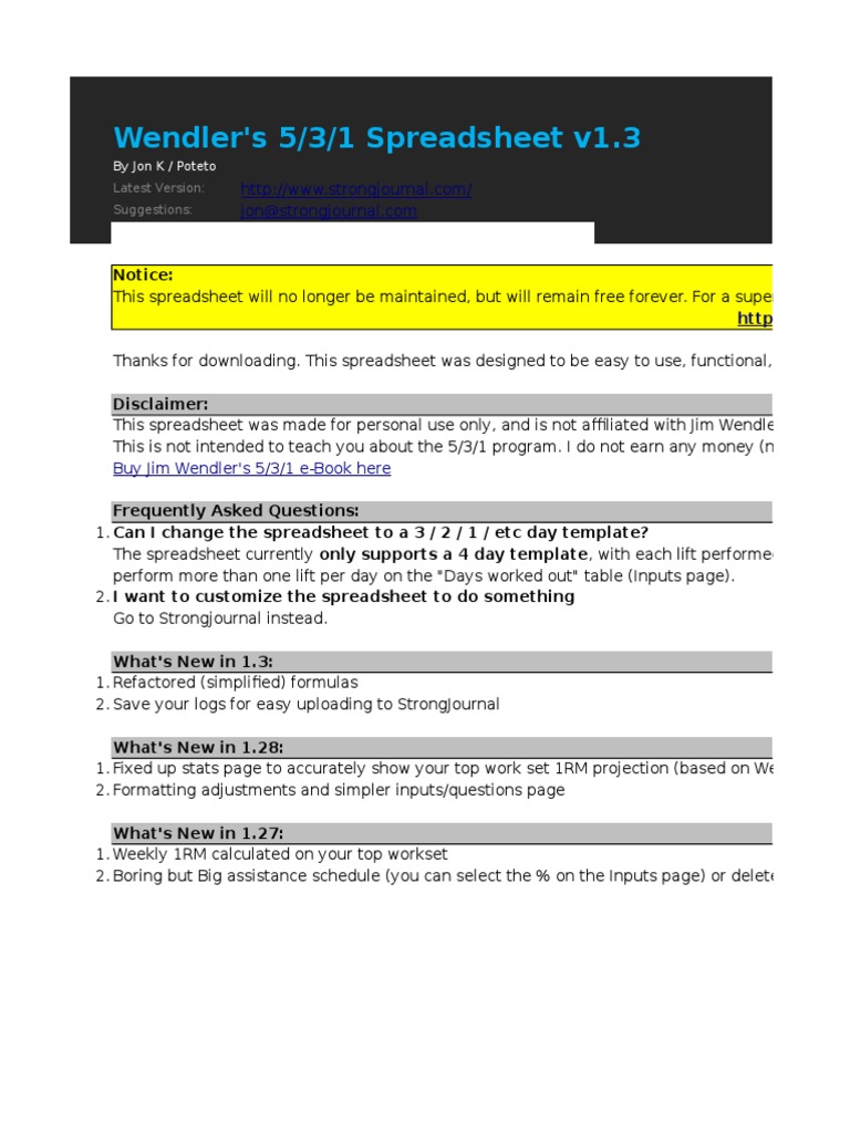 In my humble opinion, wendler's 531 is decidedly suboptimal for building muscle (basically 1 work set per lift per week) and dropping to twice a week makes it absolutely unworkable. Since i couldn't make up my mind, i created 2 versions of the 5/3/1 workout spreadsheet. Hello and thank you for downloading! How long should i continue with 5/3/1? Jim wendler books 5/3/1 forever by jim wendler.